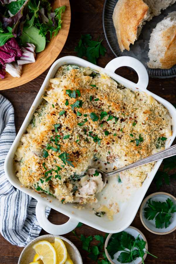 - Bake, uncovered, until golden brown and heated through, about 15 minutes. Cover the casserole loosely with foil about halfway through the baking time if the topping is starting to get too dark.