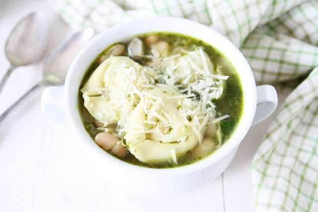 - In a large pot, heat the olive oil over medium heat. Add the onion and garlic and cook until tender, about 5 minutes. Stir in the artichoke hearts and cook for 2-3 minutes. Add the vegetable broth, beans, tortellini, and spinach leaves. Cook until tortellini is soft, about 7 minutes.