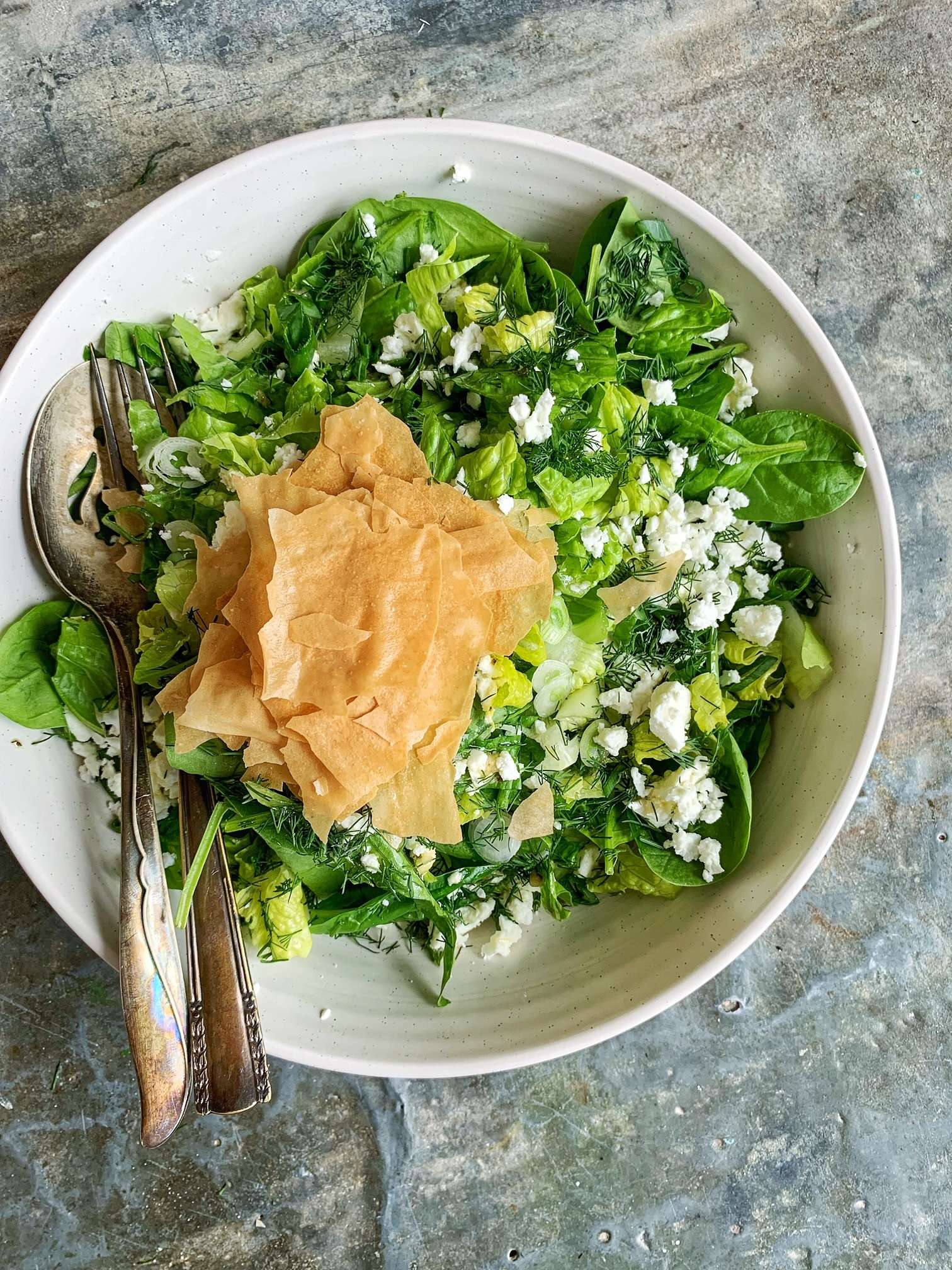 A simple, incredibly delicious Spinach Feta Salad that's great for any season. Just five ingredients - greens, feta, dill, green onion and Crispy Filo Chips - plus a vinaigrette, and you have your new go-to salad! All the flavours of Spanakopita, but in salad form.