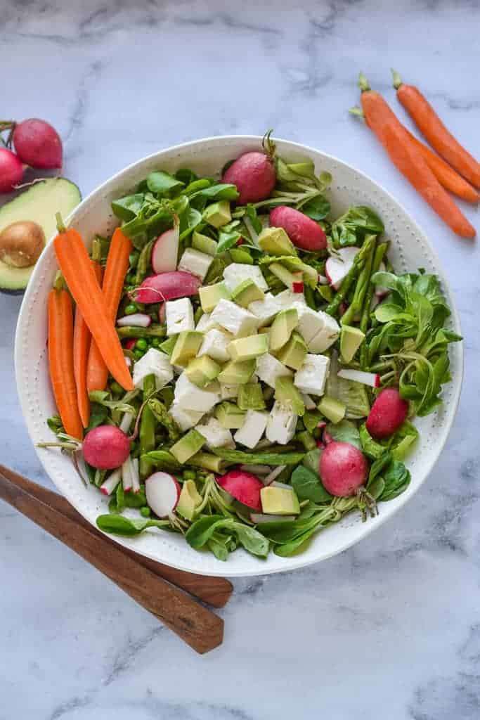 This gorgeous Spring Green Salad with Asparagus is the best way to welcome Spring! It's full of seasonal Spring produce, salty feta and drizzled with lemon dill vinaigrette. It's perfect for Easter, Mother's Day or bringing to a Spring party. {gluten free}