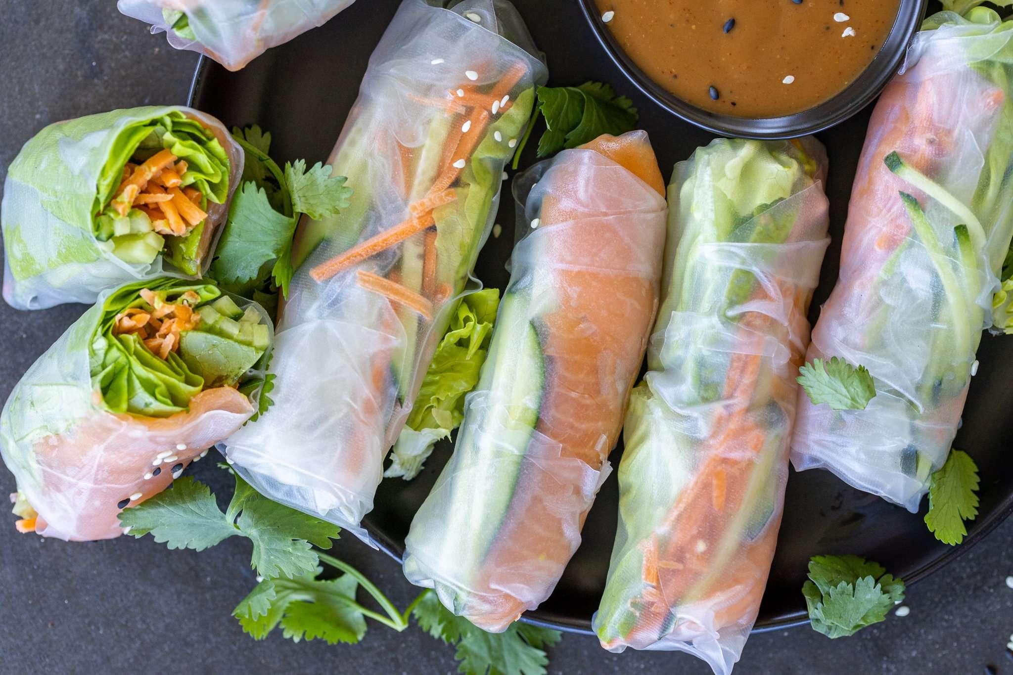 These salmon spring rolls feature smoked salmon, sliced veggies, and avocado wrapped in rice paper. A Southeast Asian staple!