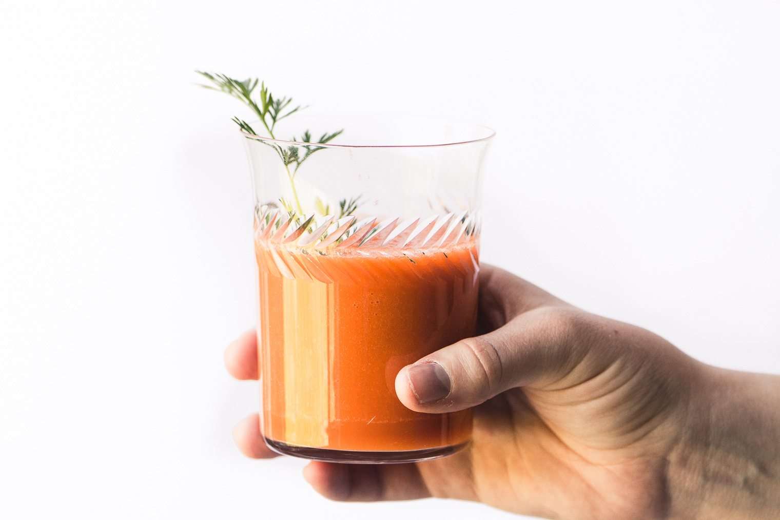 - Pour into glass or small bowl and garnish with a leafy carrot top sprig.