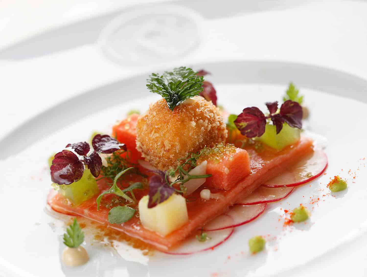 Star Anise Marinated Salmon, Flying Fish Caviar, Cucumber Jelly, Affila-Cress & Ginger