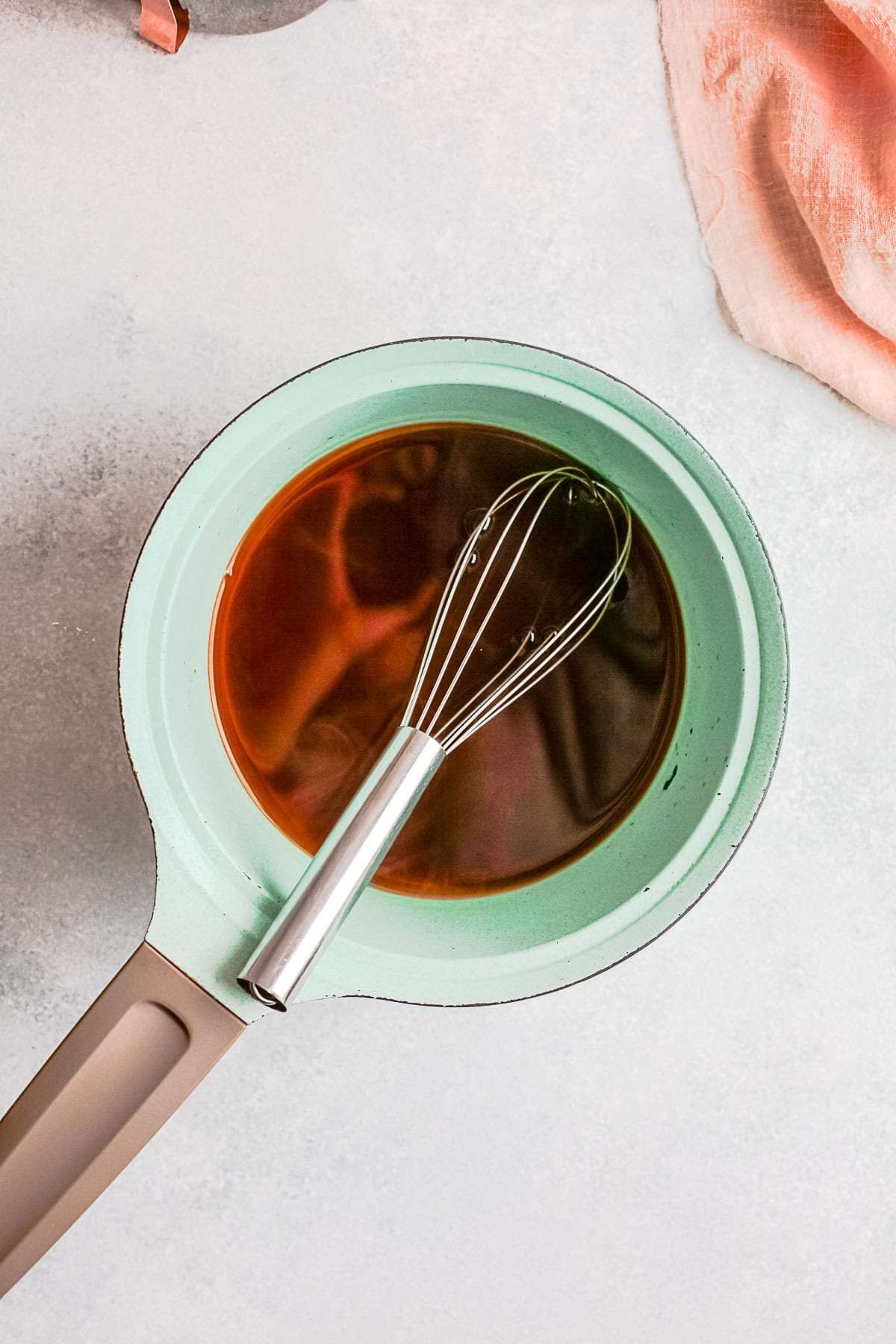 - In a small pot over medium heat combine the water, brown sugar, vanilla, and the cinnamon stick.