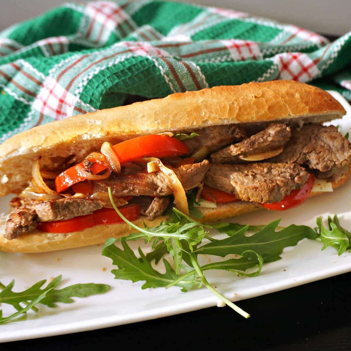 Steak and Onion Sandwich made with crusty baguettes, melt-in-your-mouth steak strips, caramelised onion and red peppers on a bed or rocket salad (arugula) and dairylea cheese slices, a fantastic recipe for a hearty lunch. It's quick and very easy to make, and it makes for a nice bite on Game Day, picnics or any other occasion.