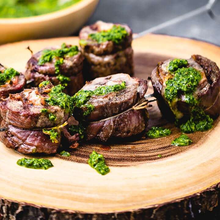 - On a hot gas grill sear the pinwheels on medium high heat for 2 minutes on each side. Lower the heat to medium-low, close the grill and continue to cook for 7-10 minutes or until the pinwheels reach an internal temperature of 130-135f for medium rare. Enjoy!