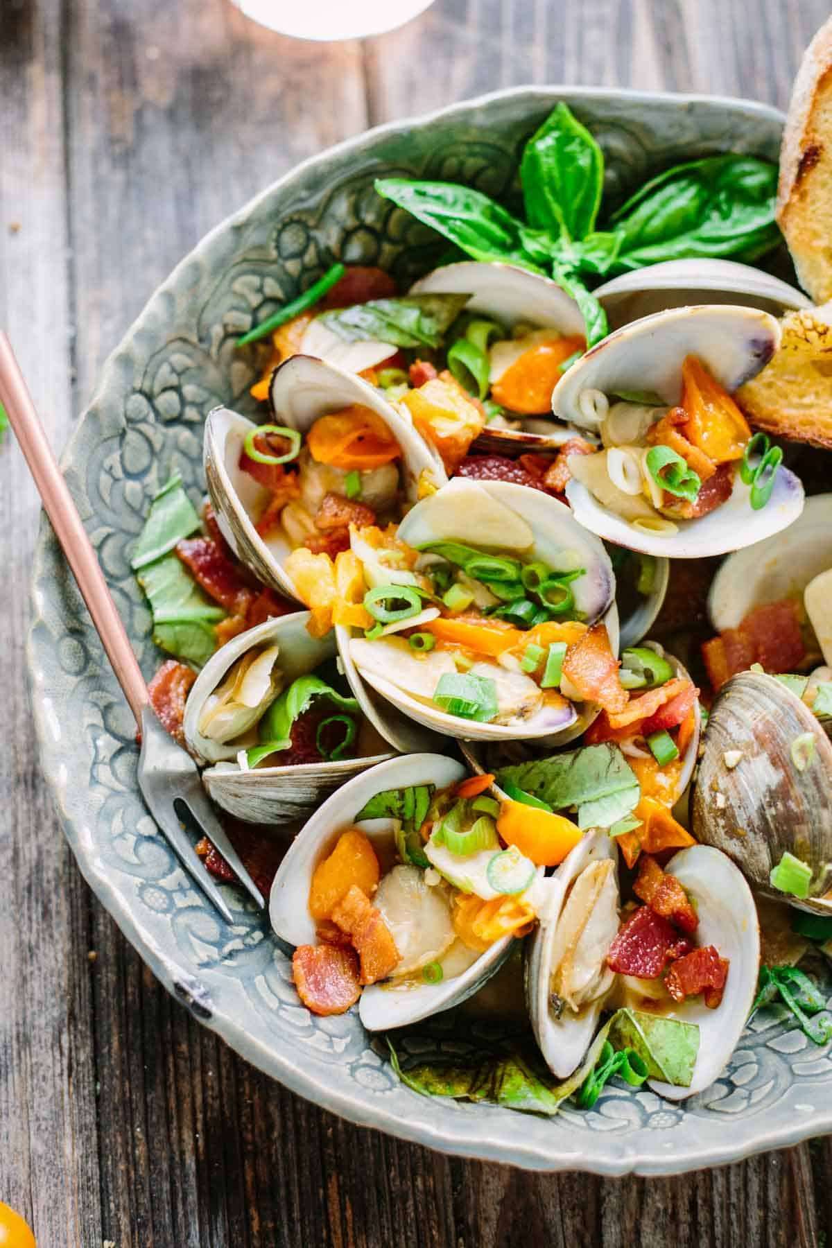 These steamed clams with bacon and tomatoes make a lovely dinner for two. It's a simple, fresh, and tasty way to enjoy fresh juicy clams with the smoky flavor of bacon and the spicy kick of jalapeño peppers.
