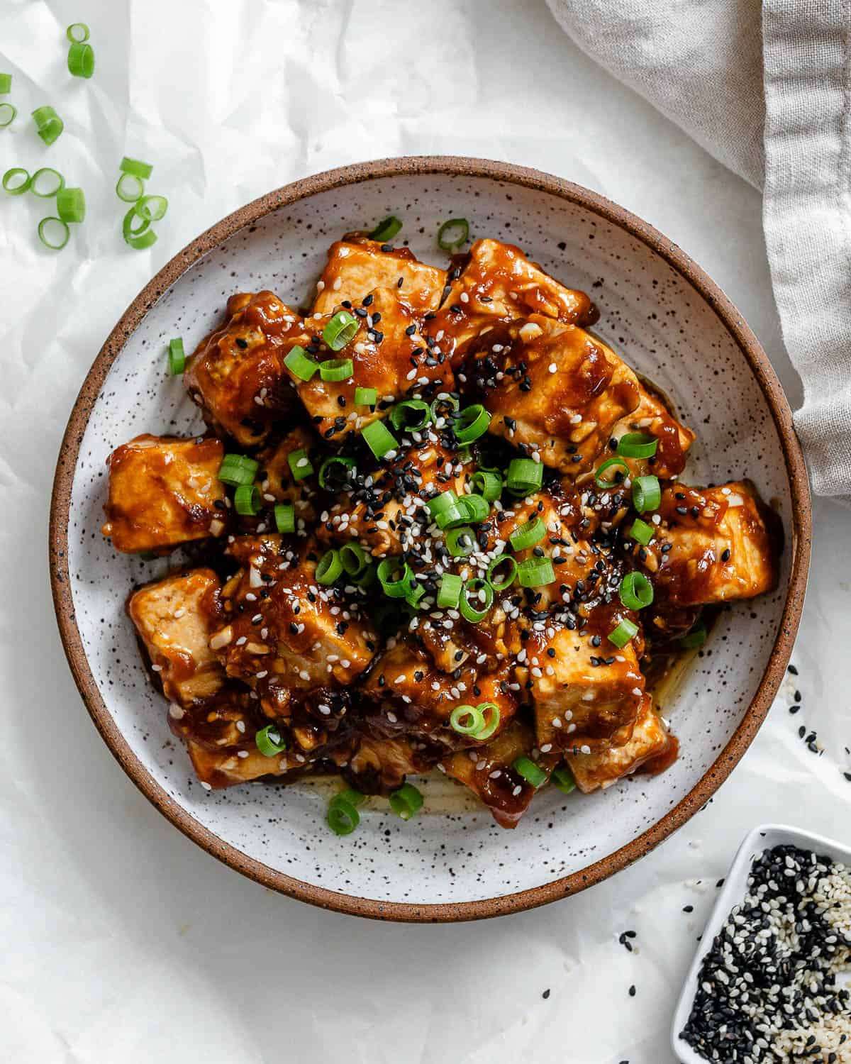 This sticky sesame tofu recipe combines cornstarch-coated crispy pan-fried tofu tossed in a mouthwatering, sweet, savory, tangy sesame sauce! A delicious gluten-free, vegan protein for noodles, stir-fries, and more!