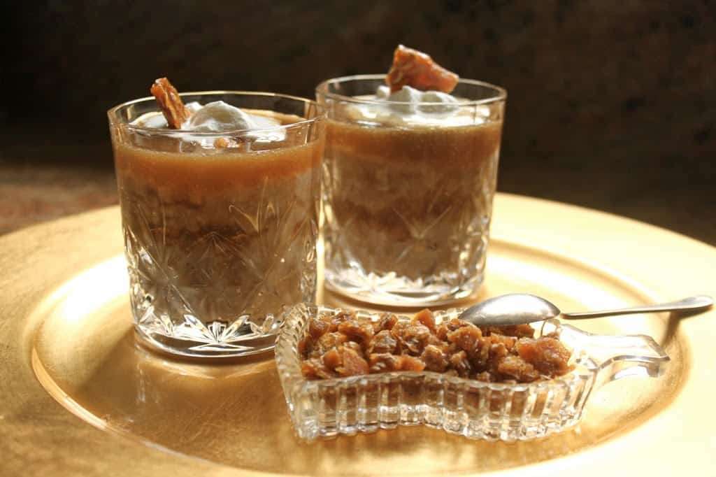 - Spoon porridge into crystal glasses about one third full; sprinkle a few pieces of the brittle and pour on a little of the sticky toffee sauce; repeat with more porridge and sauce. Add a dollop of thick cream and decorate with a larger piece of brittle. Serve warm as a dessert.
