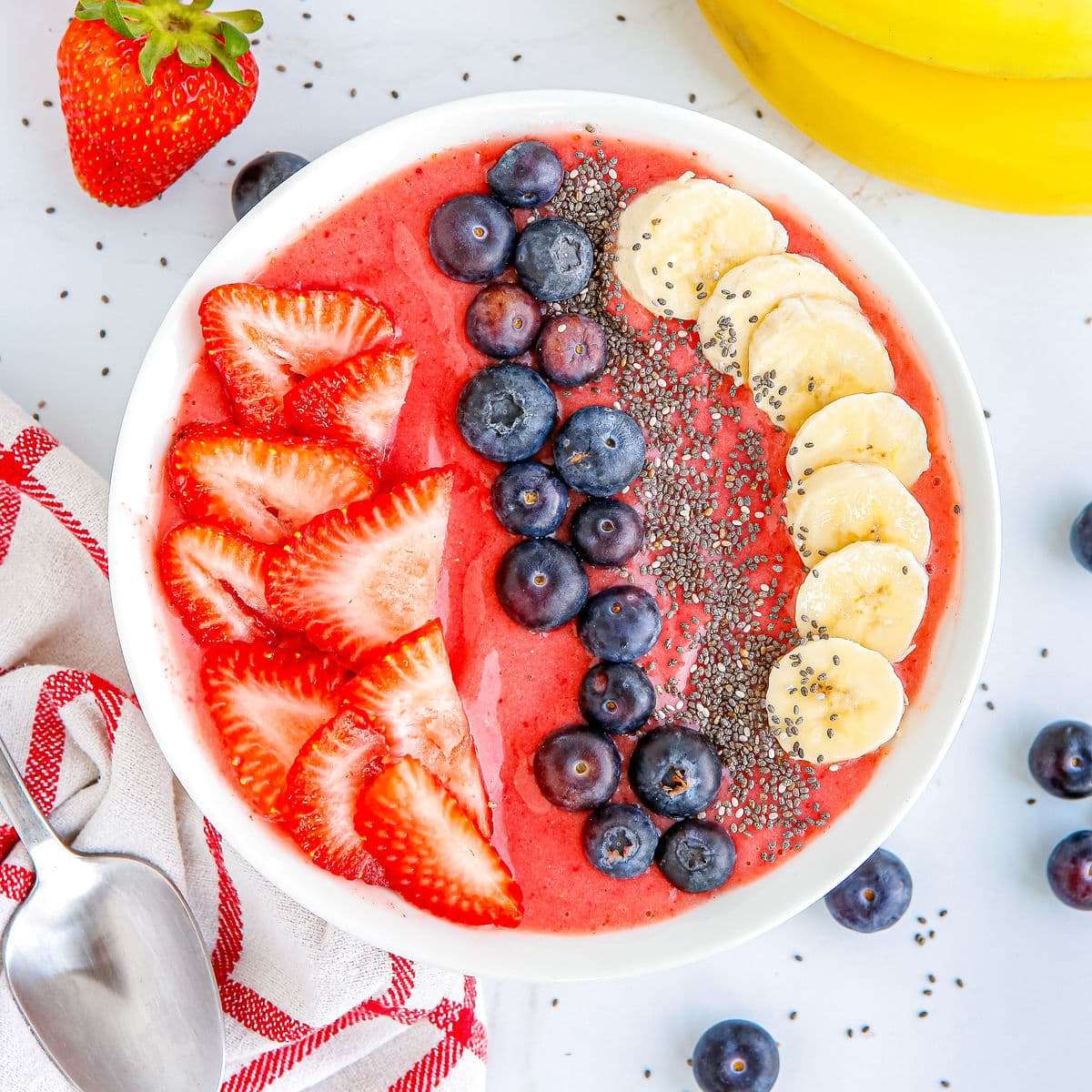 - Top the smoothie bowl with sliced bananas, strawberries, blueberries, and chia seeds.