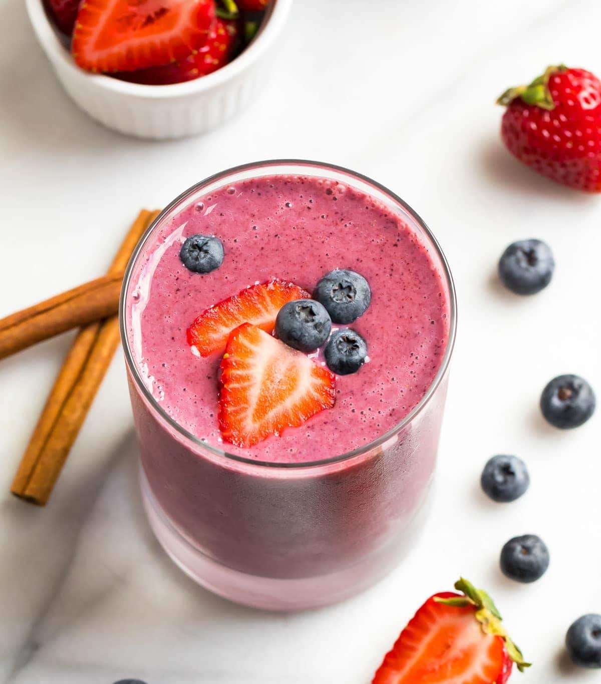 - Place all of the ingredients in a high powered blender in the order listed: almond milk, strawberries, blueberries, yogurt, and cinnamon. Blend until smooth.