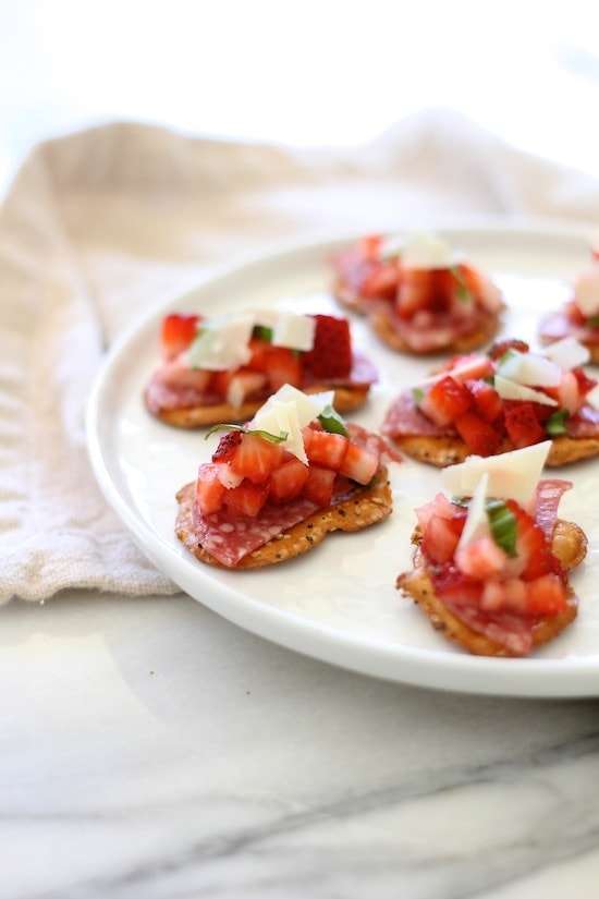 - In a small bowl, stir strawberries, basil, salt and pepper together gently. Arrange pretzel crisps onto serving platter and top with half a piece of salami. Spoon 1-2 teaspoons of the strawberry mixture overtop the salami and top with a sprinkle of parmesan cheese. Serve immediately.
