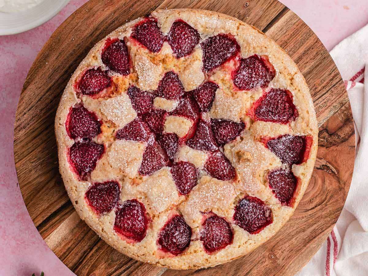 - Place the strawberries cut side down onto the top of the cake batter in a circular pattern.
