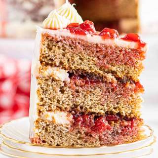 Strawberry Cake with a moist vanilla cake base from scratch finished with a strawberry topping made with fresh strawberries and sugar.