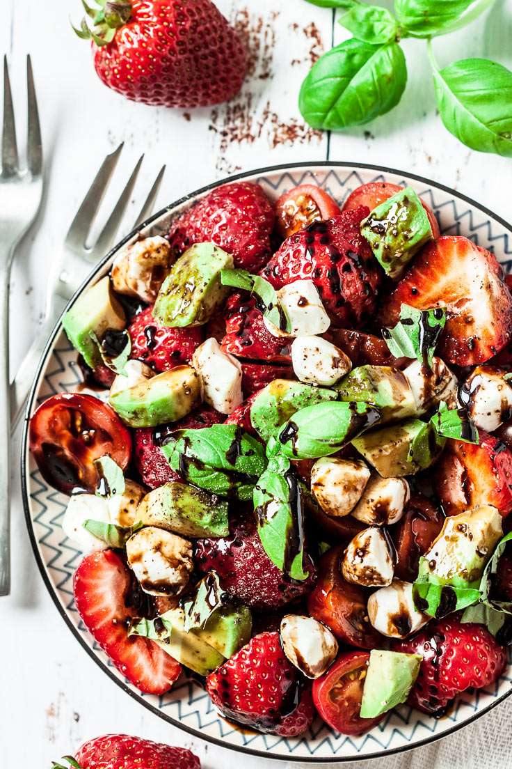 This Strawberry Caprese Salad is simple yet stunning! It's healthy, quick, and tastes irresistibly delicious. You'll want extra balsamic glaze to pour onto everything!