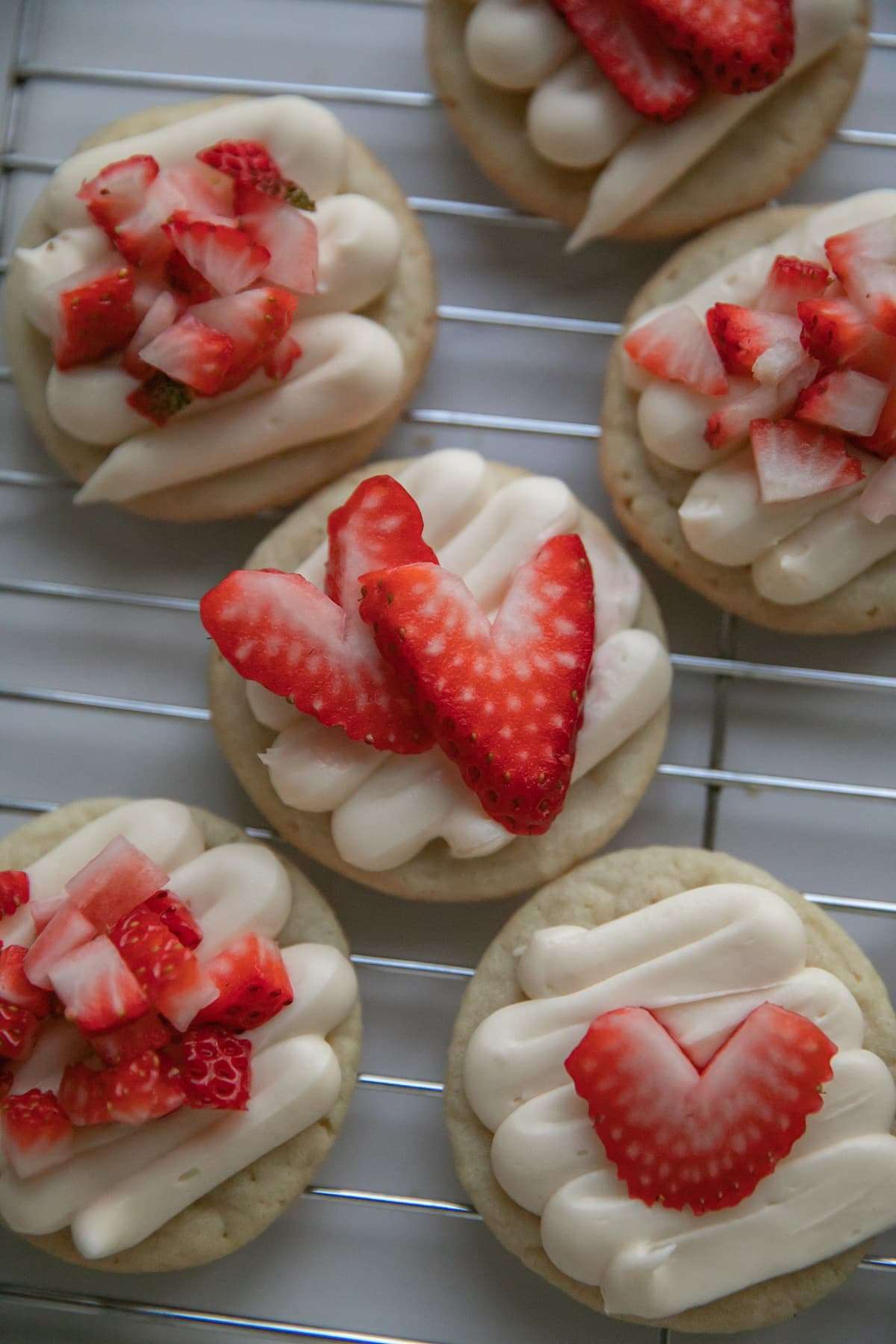- Wash and slice strawberries. Top each cookie with 1-2 tablespoons of cream cheese frosting and sliced strawberries. Store in an airtight container in the refrigerator for up to 3 days, though after 2, the strawberries will start looking sad.