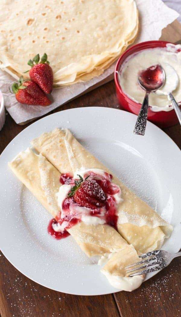 - Spoon 2 heaping tablespoons of cheesecake onto the centre of each crepe, and serve with extra strawberries. Optional: top with strawberry jam/conserve and dust with icing sugar for extra decadence