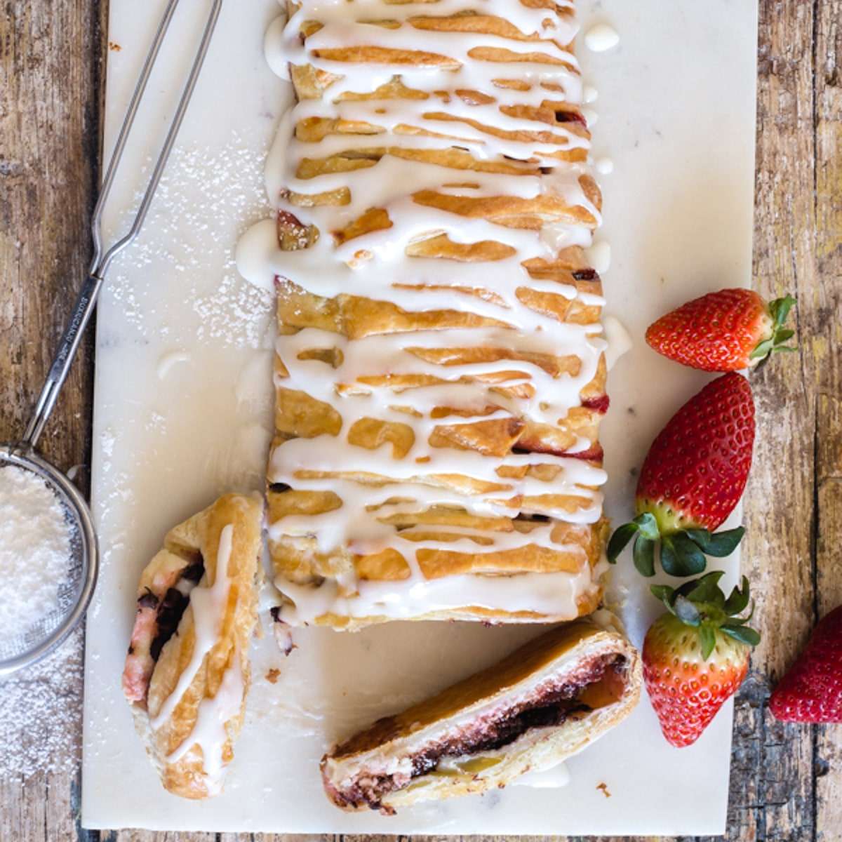 - Spread the cream cheese mixture evenly down the middle of the pastry. Top with the chopped strawberries and sprinkle with the chocolate chips. Make cuts on the side of the dough with a sharp knife until you reach the filling (see video). Criss cross the cut slits over the mixture. Then place it with the parchment paper on a baking sheet.