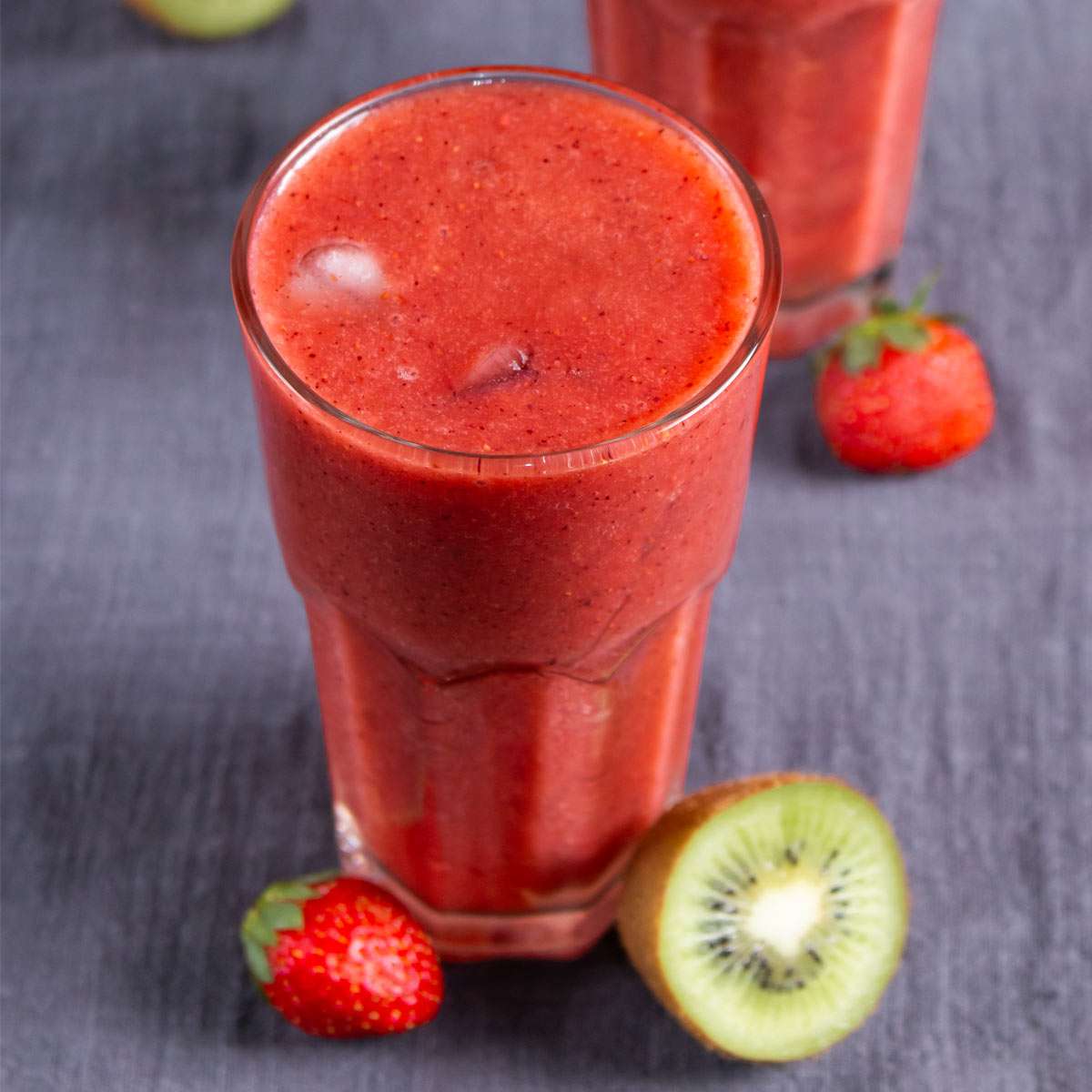 Strawberries and Kiwis turned into a bright, tasty juice. I love this thick juice for breakfast or after a workout.