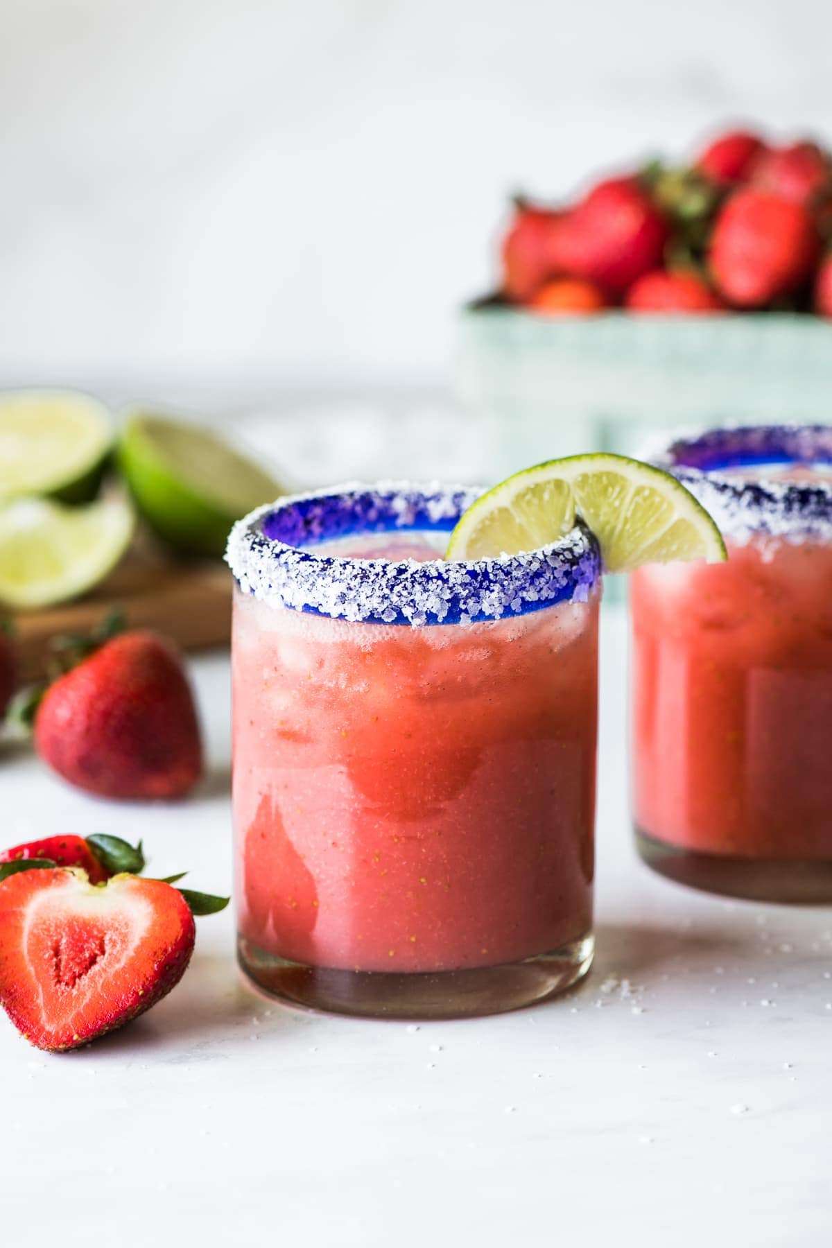 - Pour strawberry margaritas into prepared glasses. Garnish with lime wedes and serve immediately.