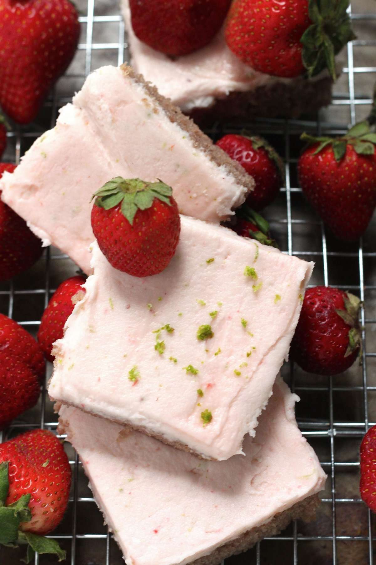 - Place strawberries, orange juice, and lime juice in the body of a blender and pulse until completely liquified. Remove 3 tablespoons of the puree and set it aside. That will be for your frosting.