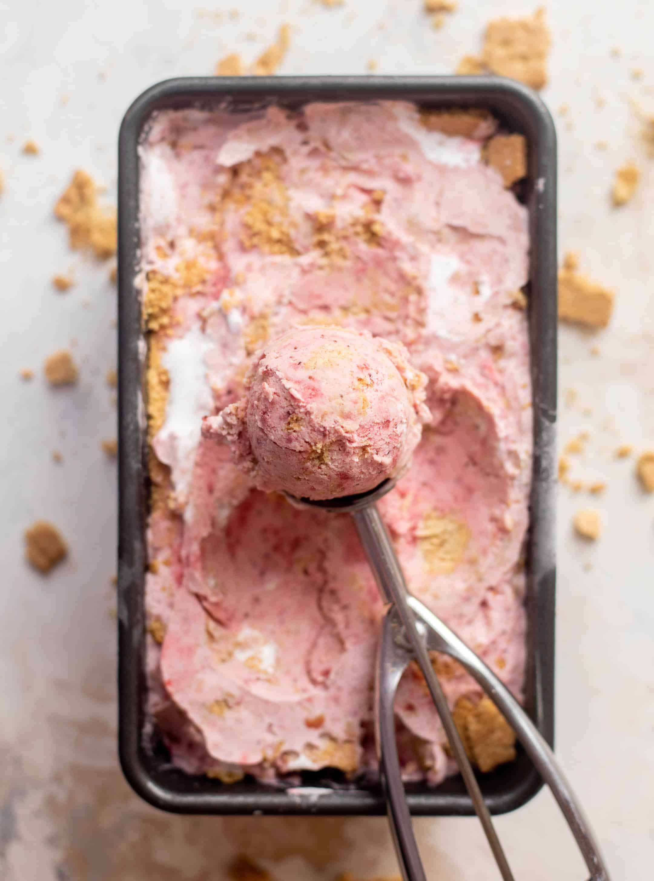 This strawberry pie ice cream is a big melty bite of summer! No churn ice cream made with fresh strawberry sauce, marshmallow cream and crushed graham crackers. Simple, easy and so incredibly delicious!