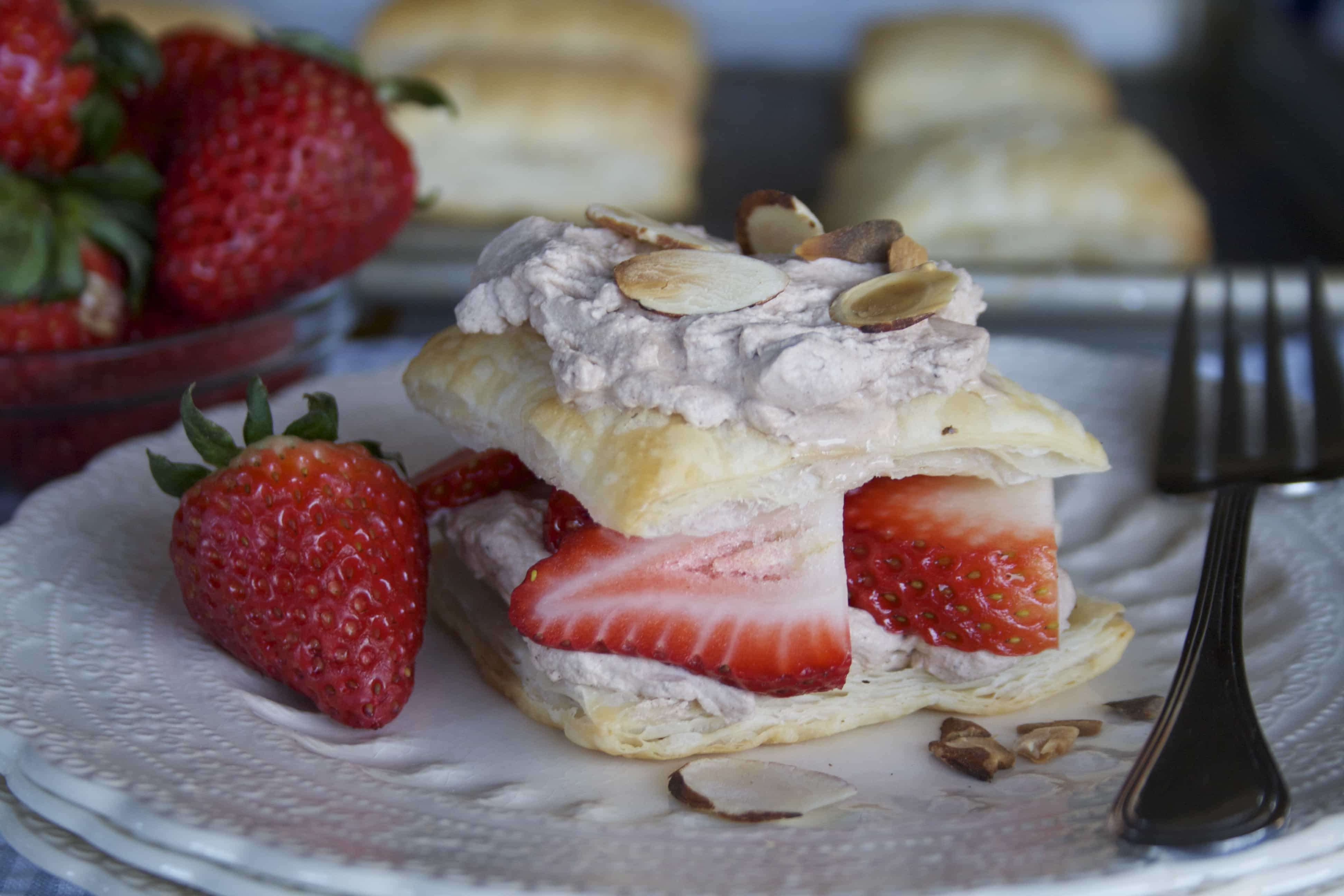 Strawberry Mille Feuille is puff pastry layered with chocolate whipped cream, strawberries and almonds. Ready in about 30 minutes!