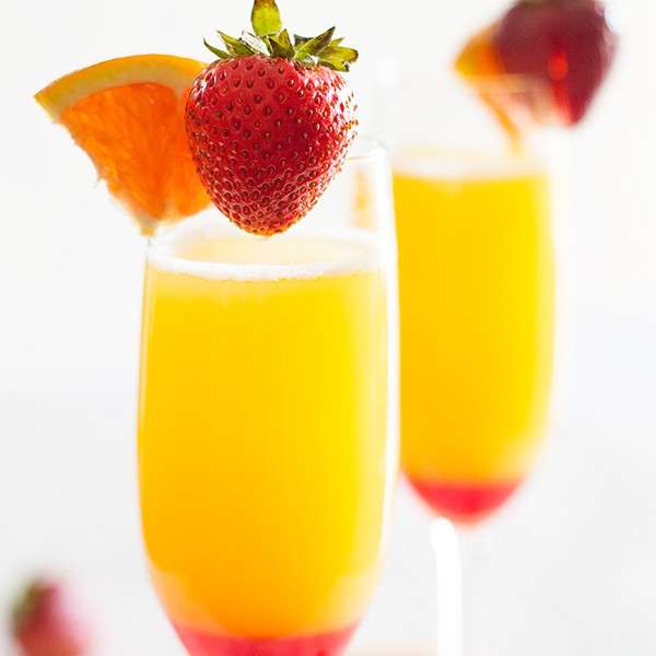 - Add 1 tablespoon of strawberry syrup to the bottom of your glass. Fill glass 1/3* of the way full with orange juice. Fill the rest of the way with champagne.