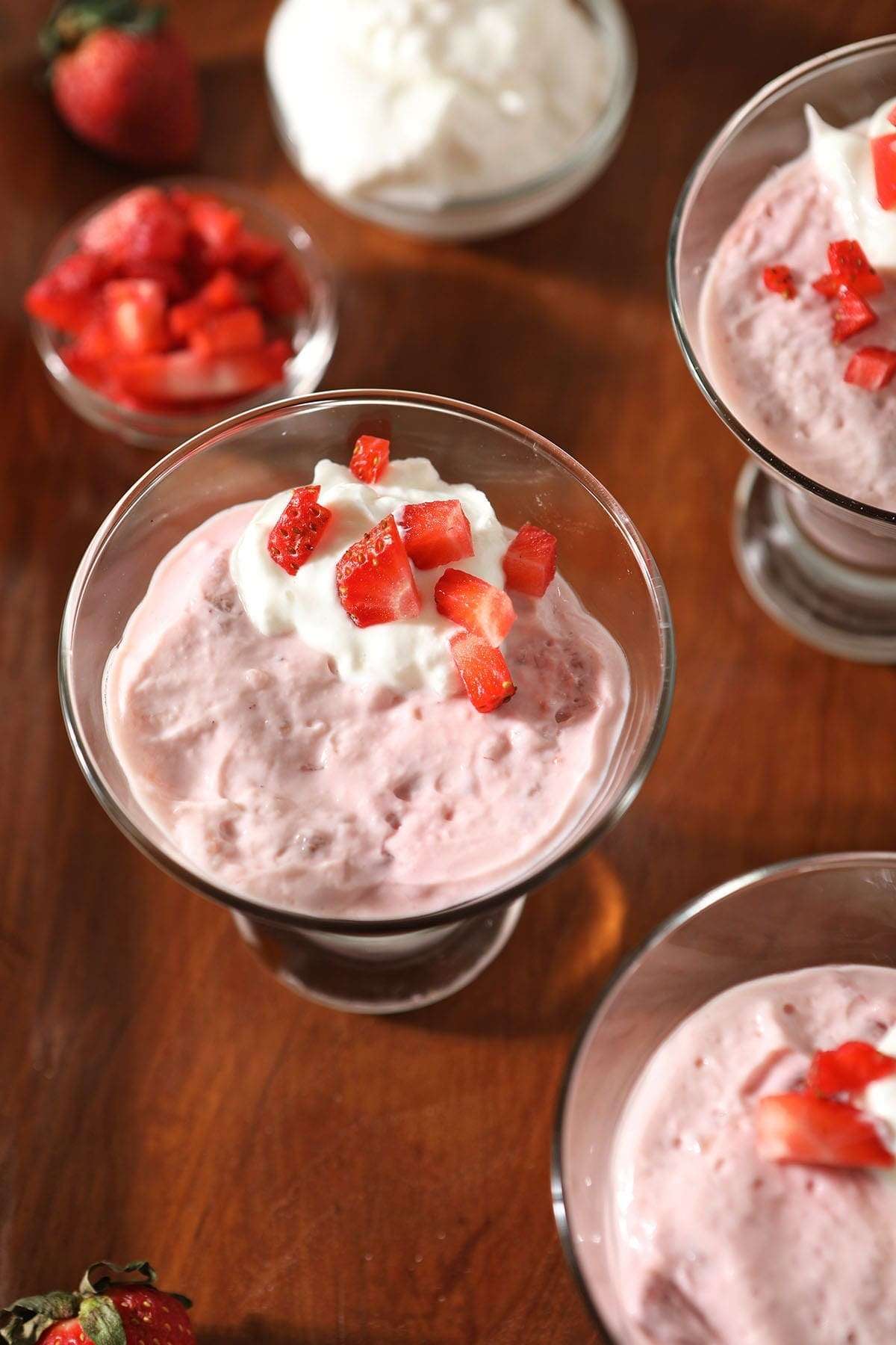 - Dollop 6 tablespoons of the mousse into your four bowls. Serve with a fresh strawberry on top of each serving!