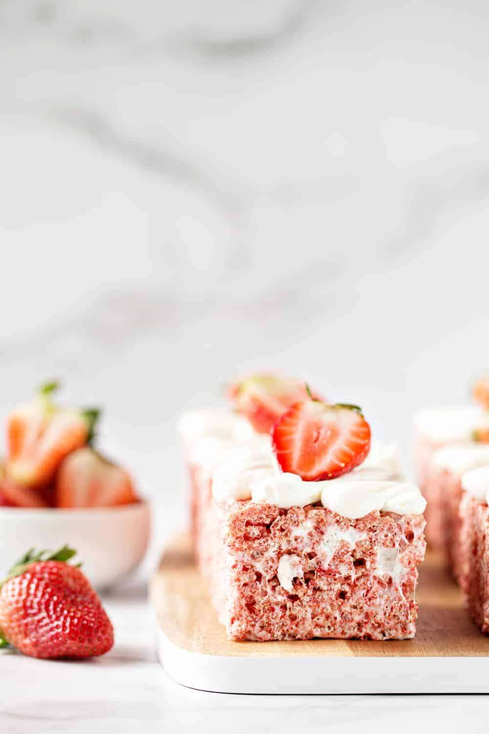 - Spread or pipe frosting onto cooled marshmallow cereal treats and top with fresh strawberries.