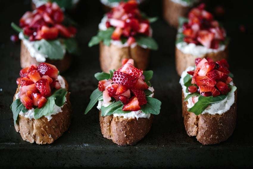 - Spread each slice with a generous layer of ricotta cheese. Top them off with arugula, strawberries, and pomegranate seeds (if using).