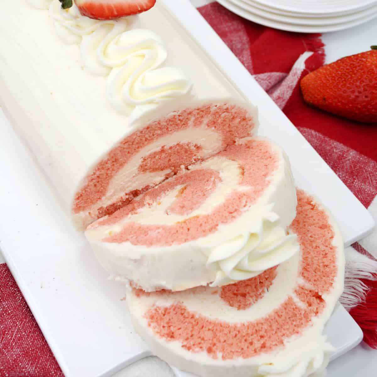 This easy Strawberry Roll Cake is made with a strawberry cake mix and a delicious cream cheese frosting and filling. Perfect for Valentine's Day!