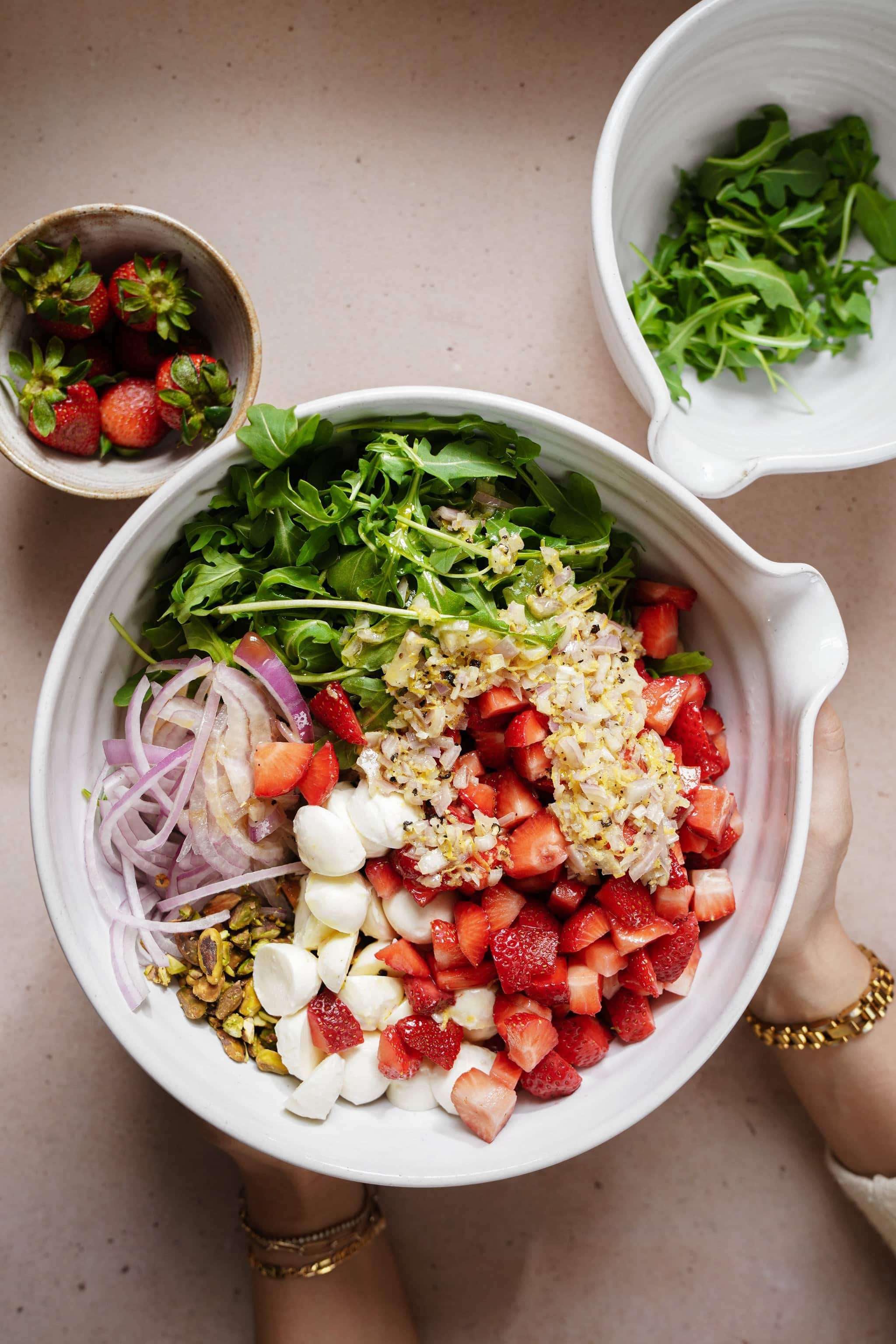 - To a large bowl add the cooled pasta, red onion, baby bocconcini, arugula and strawberries. Drizzle with the dressing and toss to combine - taste and adjust seasoning with more salt and pepper if desired. Top with pistachios and serve.
