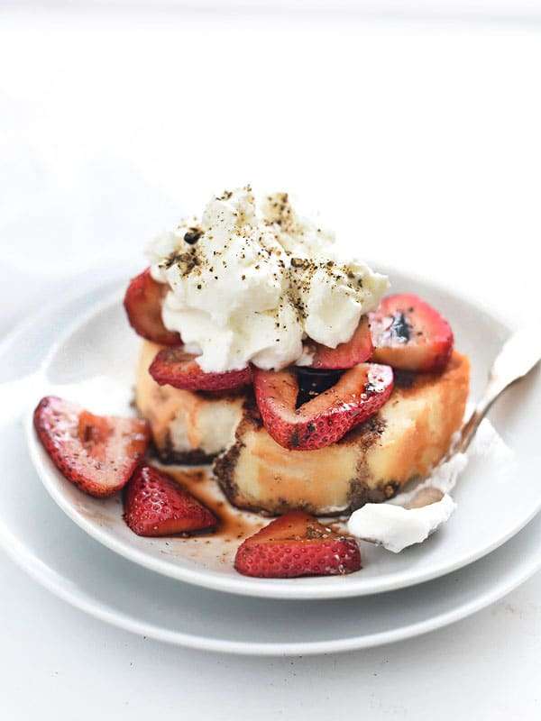 - Transfer the cake slices to serving plates and top with a scoop of the strawberries and drizzle with the marinade. Top with whipped cream and add more freshly ground black pepper if desired.