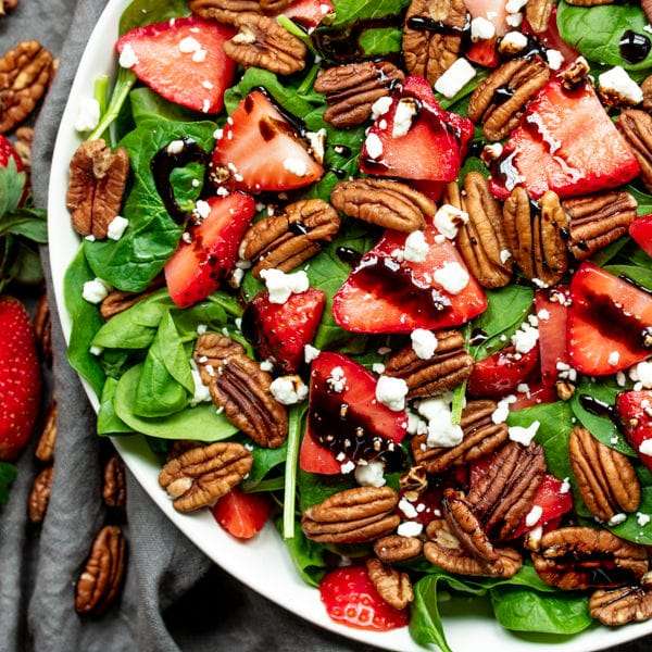 Strawberry Spinach Salad is a beautiful salad of fresh baby spinach and juicy strawberries tossed with pecan and goat cheese, and drizzle with a balsamic dressing.