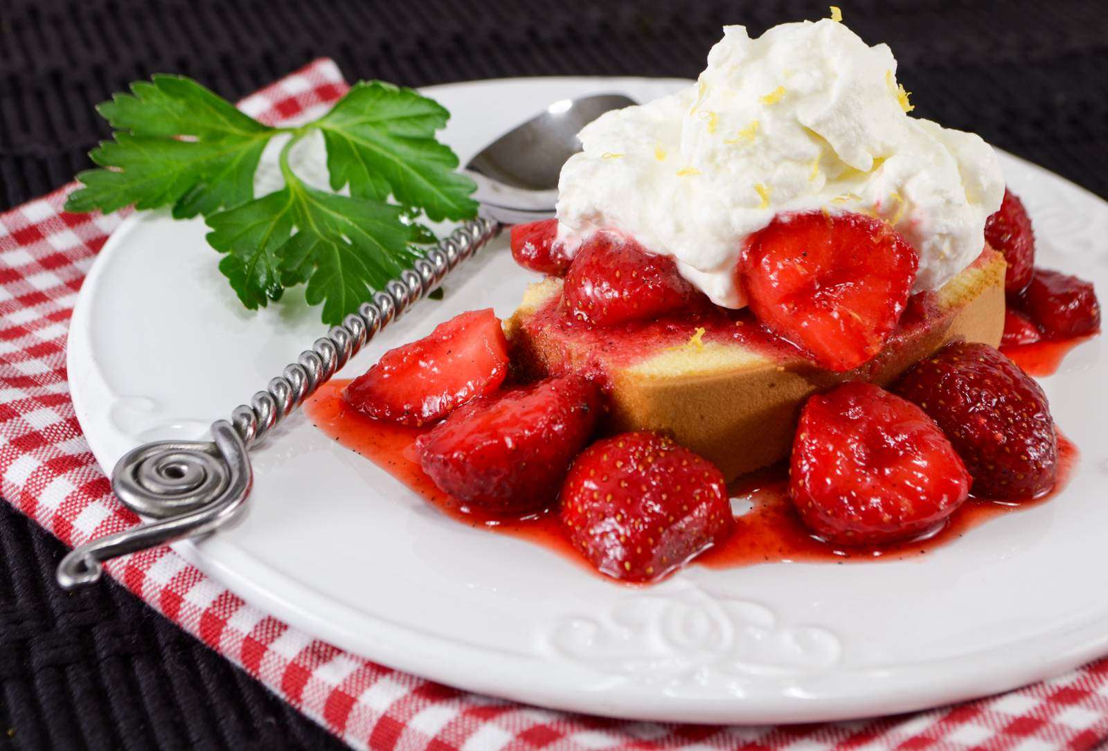 - Slice the thawed pound cake and spoon some strawberries and sauce on top of the pound cake. Add a dollop of lemon whipped cream, then a little sprinkling of lemon zest on top.