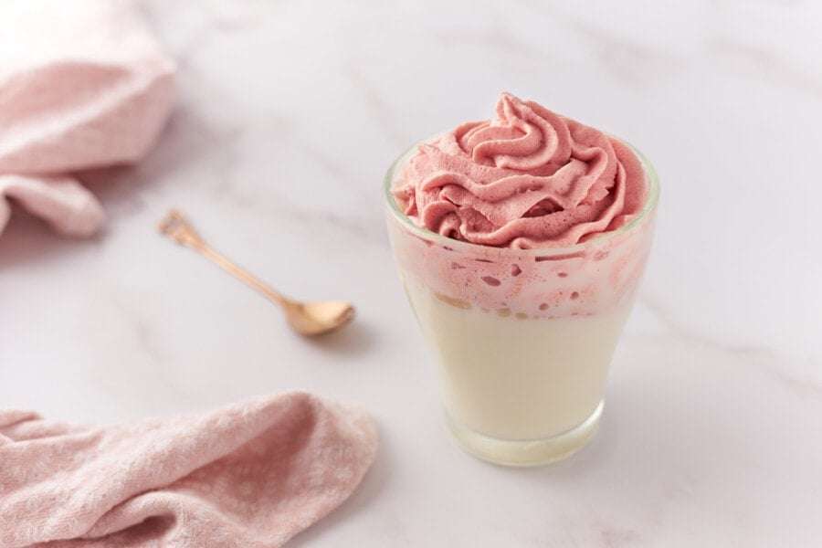 - Pour ice and milk into a cup and top with the whipped strawberry mixture.