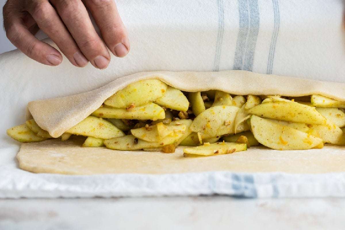 - Place half of your preferred filling mixture along the long edge of the dough. using the kitchen towel to assist, roll the dough around the filling tightly. Repeat with the remaining dough and filling.