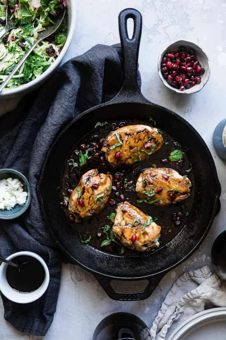 - Serve each chicken breast drizzled with some of the sauce and sprinkled with pomegranate seeds and fresh basil.