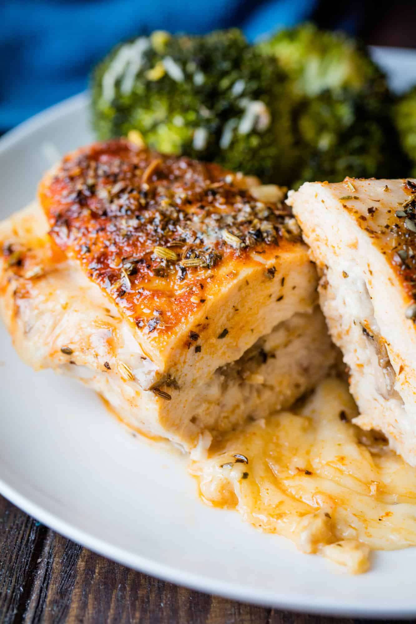 Chicken breasts stuffed with mushrooms and cheese and rubbed with a special mixture of herbs.