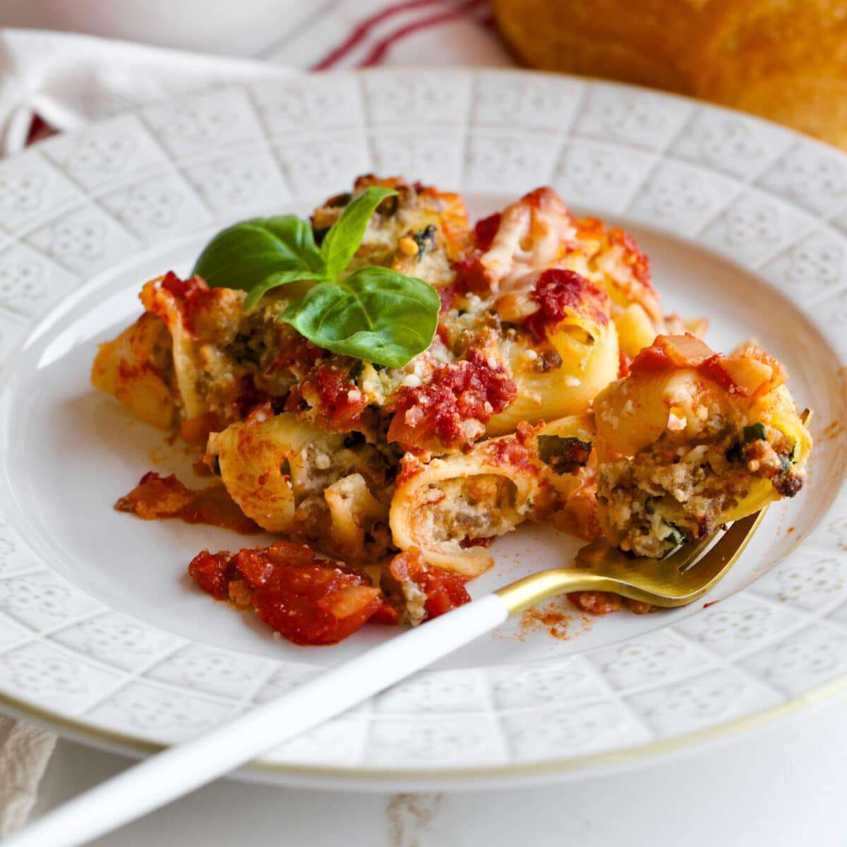 Stuffed Lumaconi Pasta Recipe with Ricotta and Sausage is a comfort food classic that will have your belly doing the happy dance! This recipe combines sweet ricotta cheese with savory delicious Italian sausage (wait, we snuck in a little spinach too). The result? An authentic Italian dish that will make everyone run to the table.