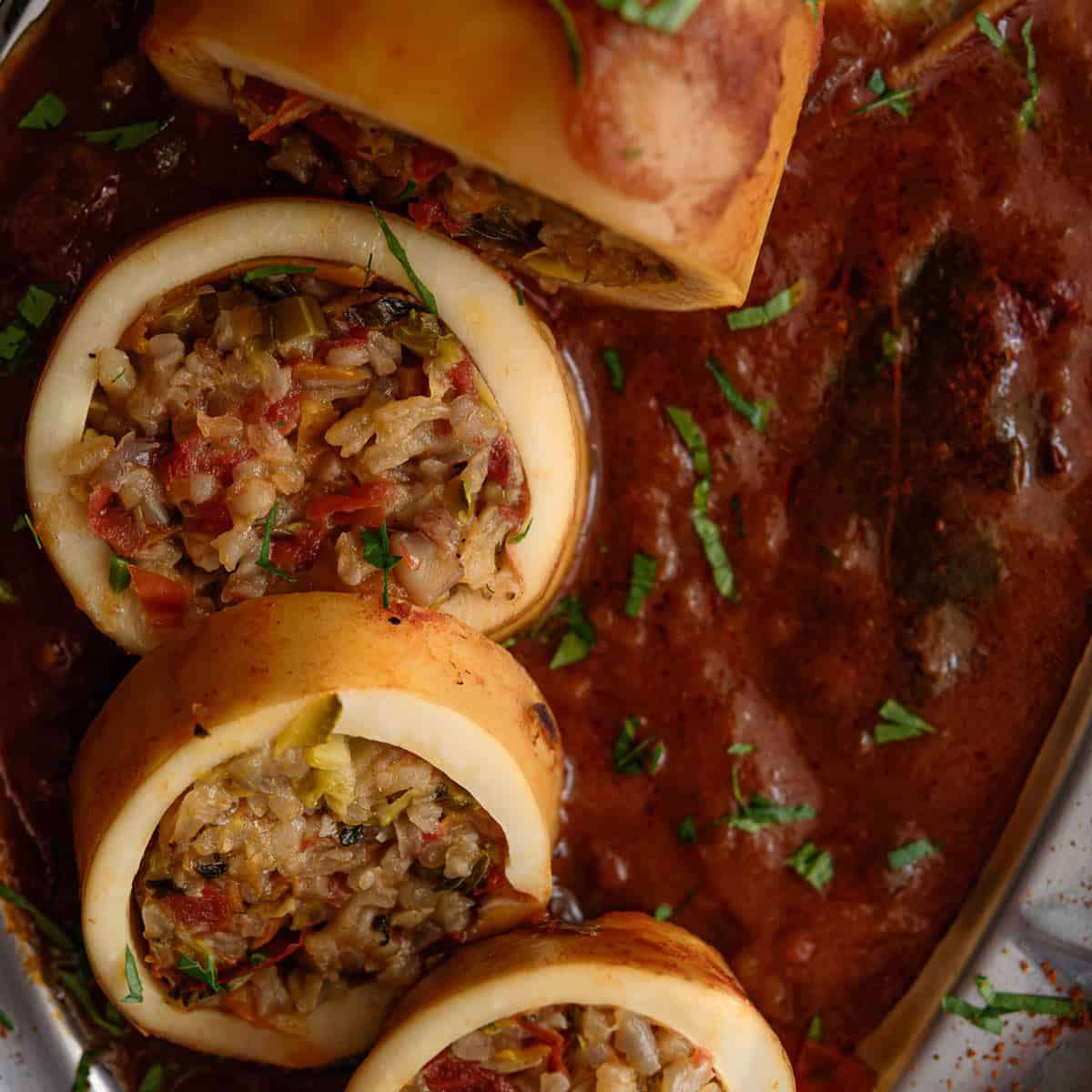 This delicious Stuffed Squid with rice is served along with a very flavorful and rich tomato sauce that's perfect for bread dipping!
