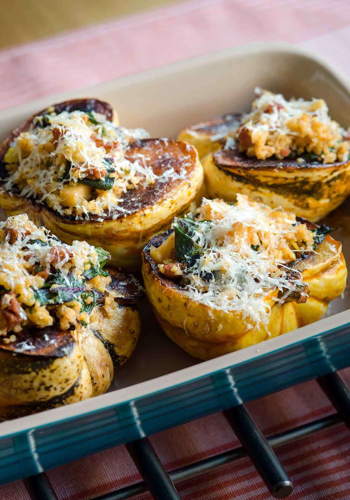 Stuffed winter squash takes many forms, including this healthy and tasty stuffed acorn squash with quinoa that you can easily make vegetarian.