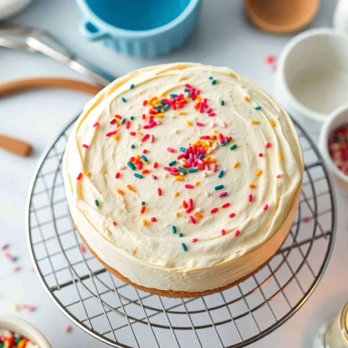 - Garnish and serve: Before serving, remove the sides of the springform pan. Top the cheesecake with whipped cream, sprinkles, and crumbled or whole sugar cookies, if desired.
