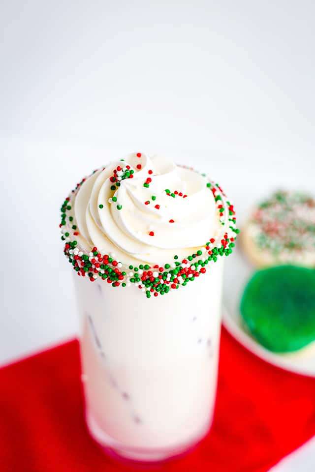 This sugar cookie cocktail is sweet with a pronounced vanilla flavor that when paired with the frosting and sprinkle rimmed glass allows you to sugar cookie like an adult.
