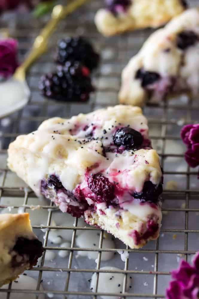 Sweet summer berry scones are buttery scones made with fresh summertime berries, a sunny lemon glaze, and a sprinkling of poppy seeds.