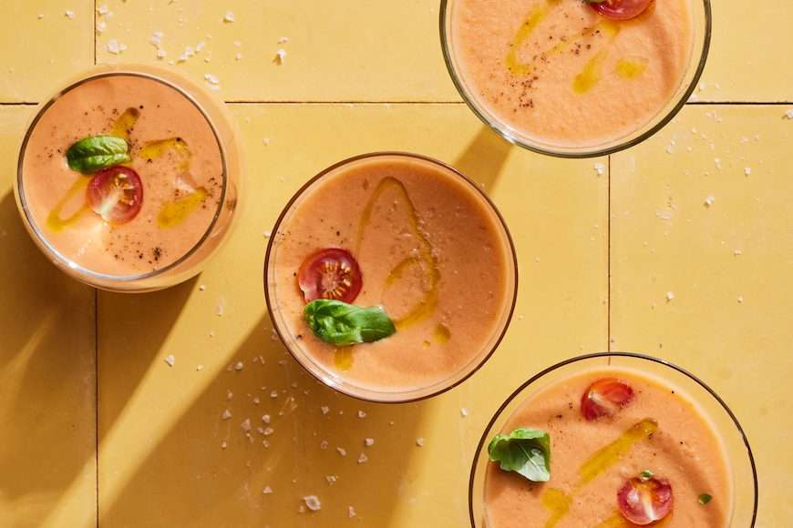- In a blender, combine the tomatoes, pepper, cucumber, onion, garlic, chives and basil. Blend on high speed until super smooth, at least 2 minutes. Scrape down the sides and blend for another minute.