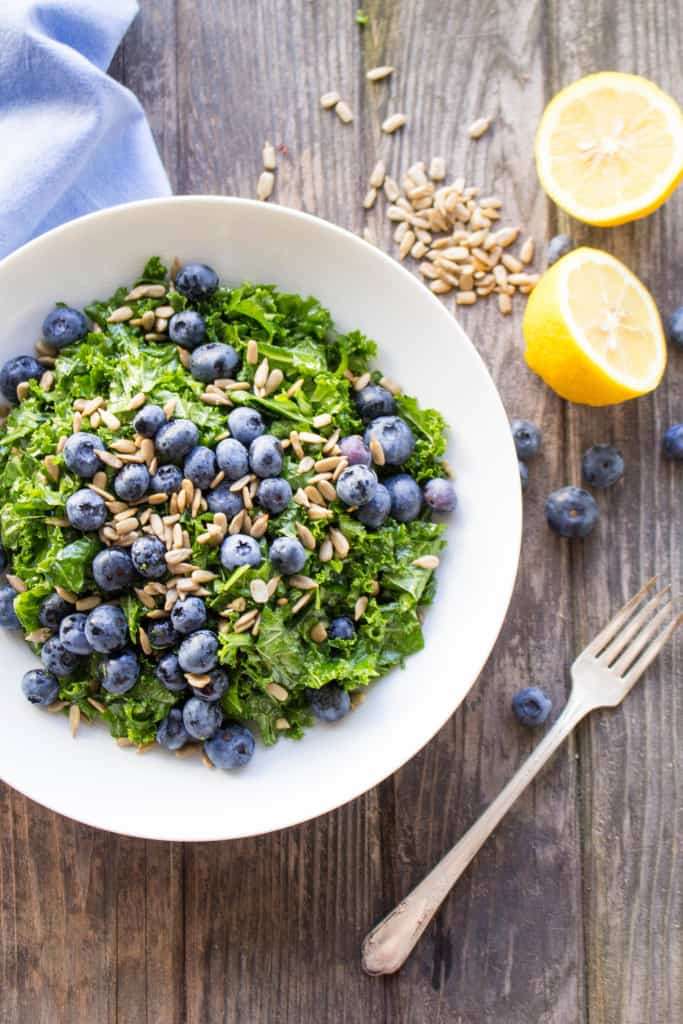 Easiest ever summer salad recipe with a simple honey lemon vinaigrette, crunchy sunflower seeds, sweet blueberries and massaged kale! It's gluten free, vegan, plant based, paleo and tastes amazing!