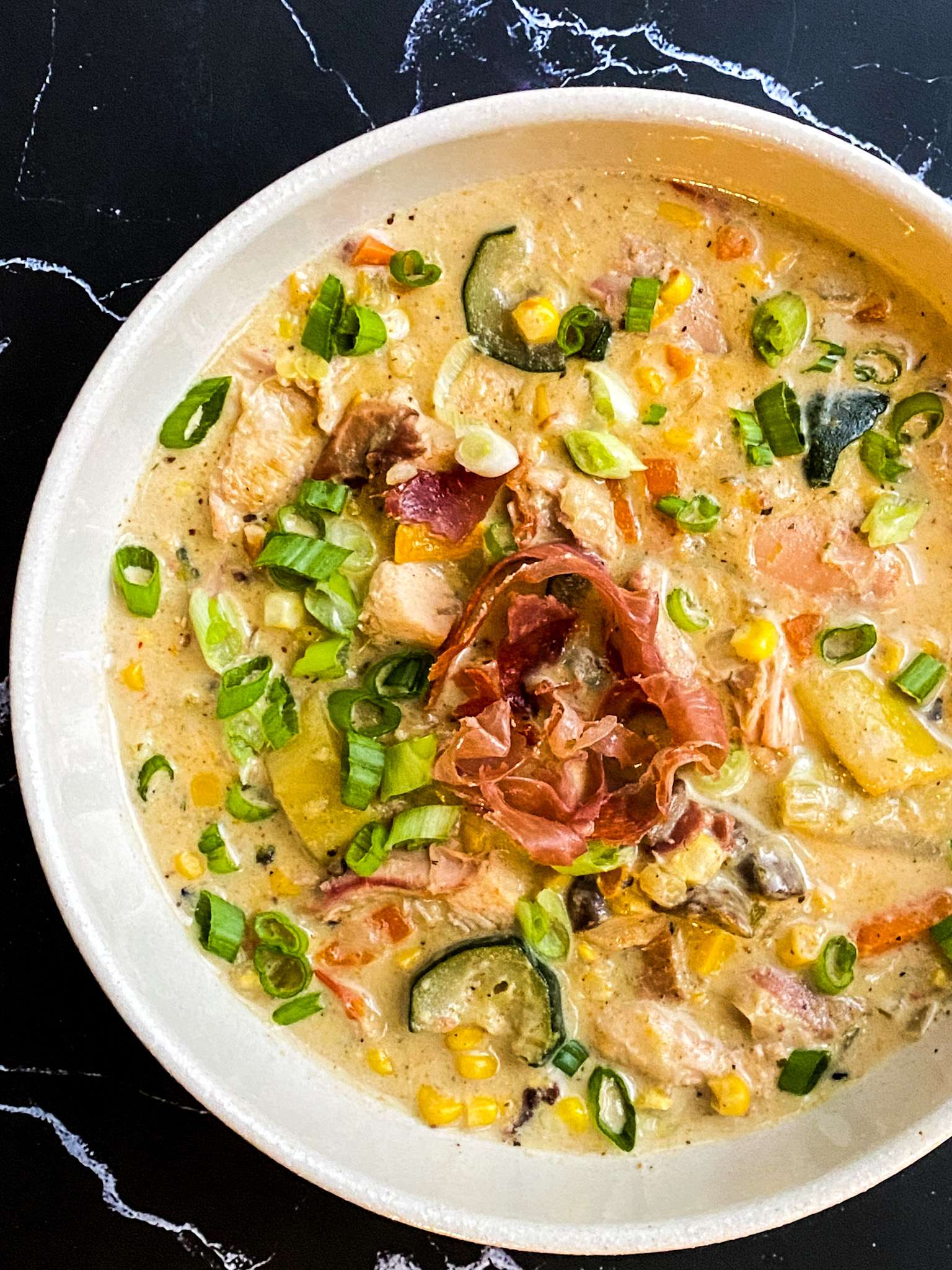 Creamy and fresh summer corn chowder loaded with seasonal corn and zucchini and topped with prosciutto. This simple chowder recipe is made with fresh sweet corn from the cob and jam packed with flavor and nutrients.