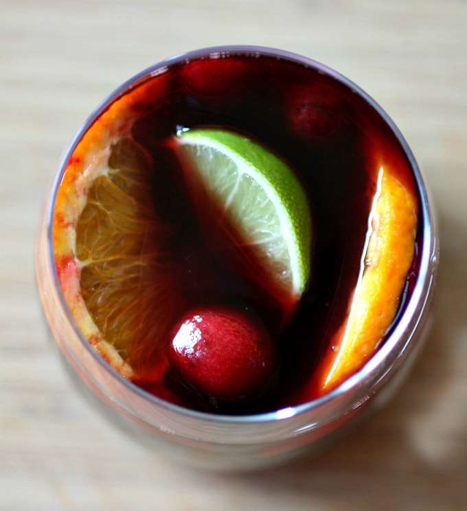 - To serve, fill each glass with ice, fill it 2/3 of the way full with the wine mixture, and top it with seltzer water. Don't forget to eat the delicious wine soaked fruit!